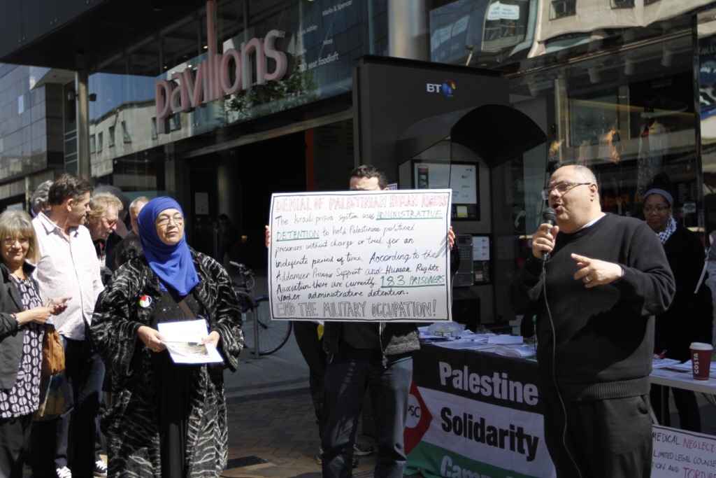 Birmingham city centre stood in solidarity with Palestinian prisoners, particularly 200 Administrative detainees on hunger strike since the 24th of April. The month of May is particularly poignant when one considers that 66 years ago, Zionist terrorists were busy ethnically cleansing 500 Palestinian towns and villages, forcing 800,000 native Palestinians into exile.