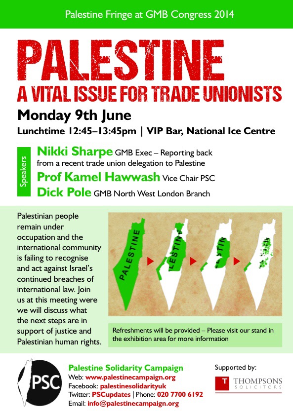 Palestine: a vital issue for Trade Unionists On June 3, 2014 By kamelhawwashIn Apartheid, BDS, Israel, Occupation, Palestine, Prisoners, Refugees, Right of Return, War crimes Will be speaking at GMB Conference Fringe meeting in Nottingham Share this: Click to share on X (Opens in new window) X Click to share on Facebook (Opens in new window) Facebook Click to share on Pinterest (Opens in new window) Pinterest Click to share on WhatsApp (Opens in new window) WhatsApp Click to email a link to a friend (Opens in new window) Email Like Loading...