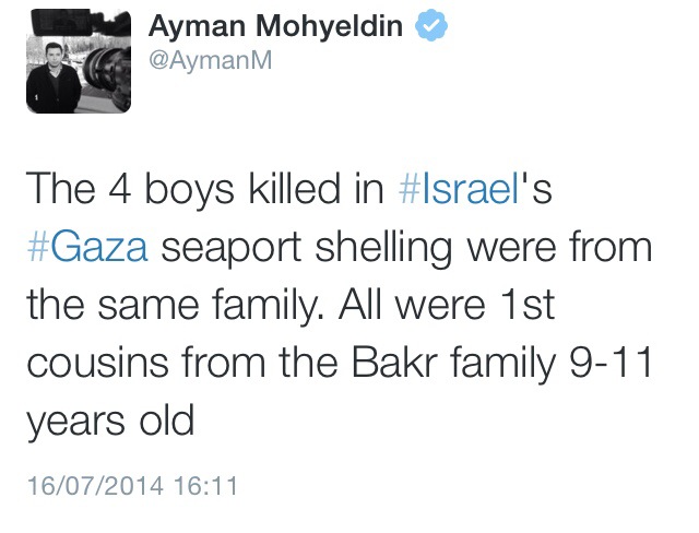 The number of dead Palestinians in Gaza surpassed 210. Today also saw the murder of four children 9-11 years old playing on Gaza’s beach.
