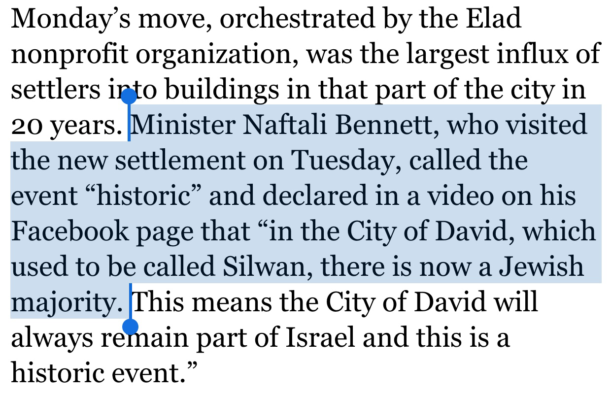 Bennet on a visit to recently taken homes of Palestinians in Silwan that the area was ‘formally called Silwan, now the ‘City of David’.