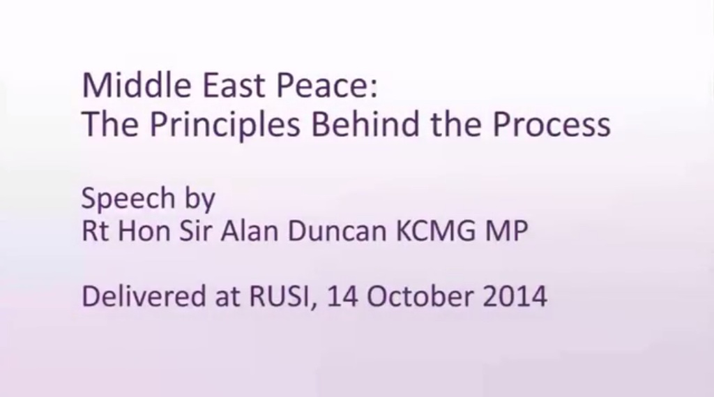 Following the UK Parliament overwhelming vote to recognise Palestine as a state, Sir Alan Duncan MP makes an astonishing speech to the Royal United Services Institute entitled: ‘Middle East Peace- The Principles behind the Process’.