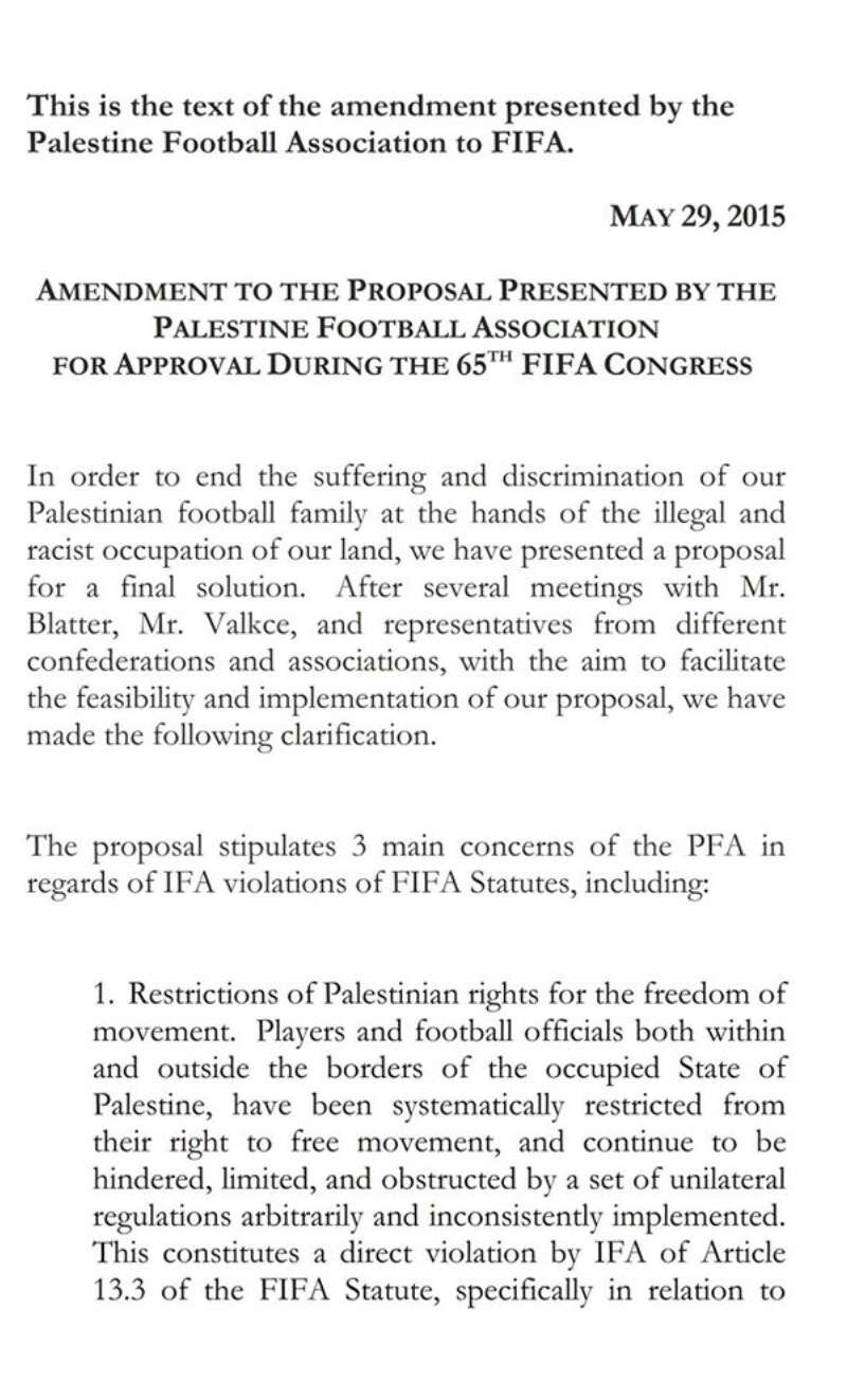 Below us s copy if the resolution passed by FIFA Congress on Friday 29/5/2015 Via @jibrilrajoub.