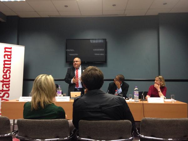 The fringe meeting was chaired by Stephen Bush , Editor of the Staggers, New Statesman. The other speakers were Dr Tania Mathias, a recently elected Conservative MP for Twickenham, and Arthur Goodman from Jews for Justice for Palestinians.