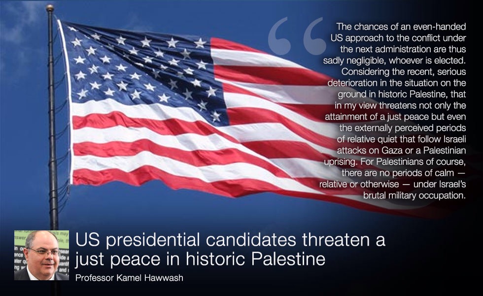 All candidates for the US presidency are likely to stand with Israel both in word and deed if elected. To varying degrees they have swallowed Netanyahu’s propaganda which claims that resolving the Palestinian issue is not the most pressing matter in the Middle East. First, it was the distraction of the Iran nuclear deal and now it is Syria, Iraq and the threat from “radical Islamic terror” which is being used to trump justice and peace.