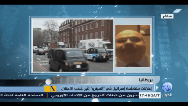 إعلانات مقاطعة إسرائيل في “الميترو” ببريطانيا تثير غضب الإحتلال On February 23, 2016 By kamelhawwashIn Apartheid, BDS, Interview, Israel, Media, TV, UK, فلسطين, video, إحتلال, إسرائيل مقابلة تلفزيونية على قناة الحوار بتاريخ ٢٣/٢/٢٠١٦ Share this: Click to share on X (Opens in new window) X Click to share on Facebook (Opens in new window) Facebook Click to share on Pinterest (Opens in new window) Pinterest Click to share on WhatsApp (Opens in new window) WhatsApp Click to email a link to a friend (Opens in new window) Email Like Loading...