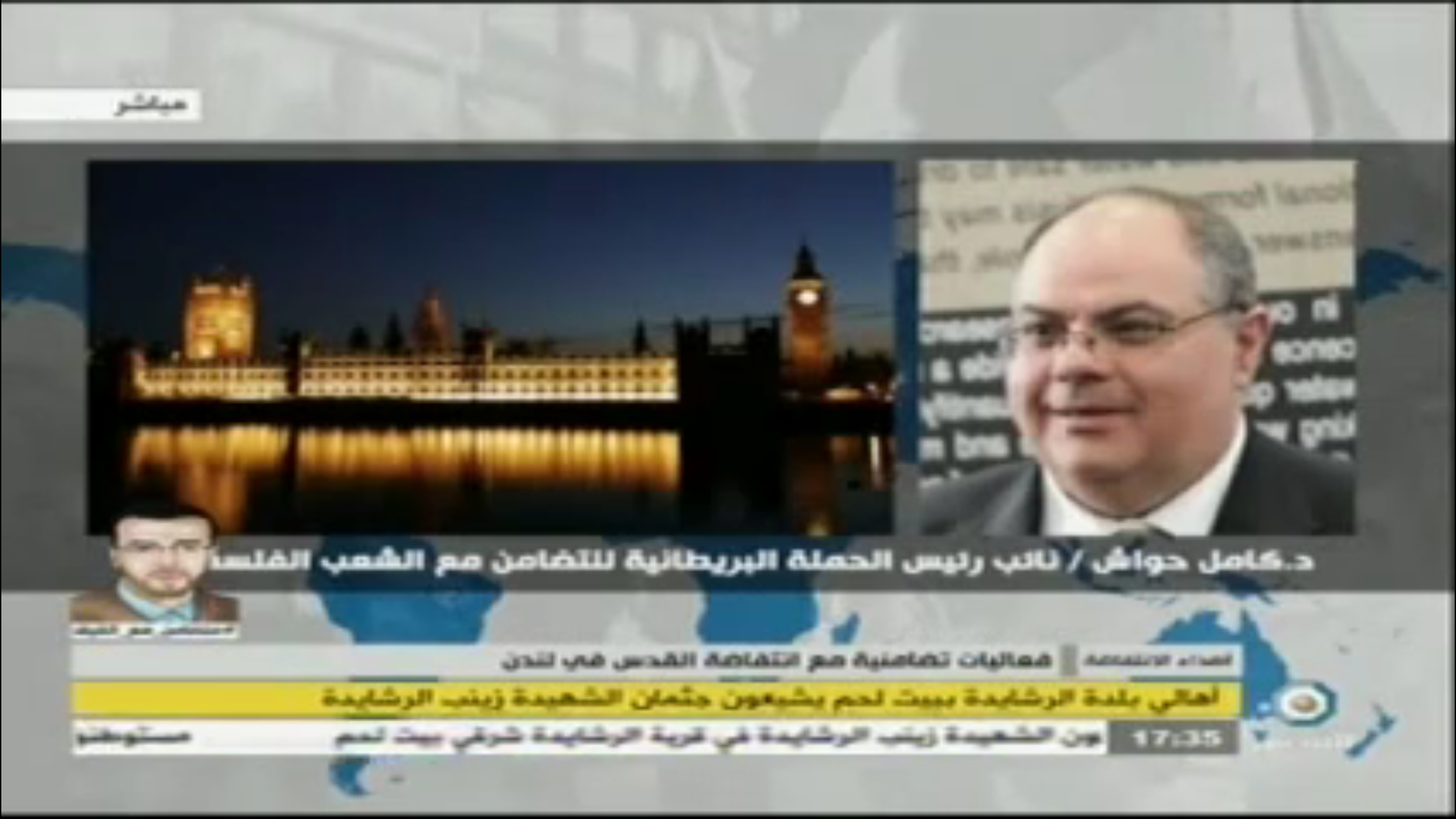 مقابلة مع قناة القدس عن فعاليات التضامن مع فلسطين On February 25, 2016 By kamelhawwashIn BDS, Britian, Interview, Intifada, Israel, Media, Palestine, TV, فلسطين, video, إحتلال, إسرائيل, تضامن, عربي مقابلة مع قناة القدس عن فعاليات التضامن مع فلسطين بتاريخ ٢٤/٢/٢٠١٦ Share this: Click to share on X (Opens in new window) X Click to share on Facebook (Opens in new window) Facebook Click to share on Pinterest (Opens in new window) Pinterest Click to share on WhatsApp (Opens in new window) WhatsApp Click to email a link to a friend (Opens in new window) Email Like Loading...