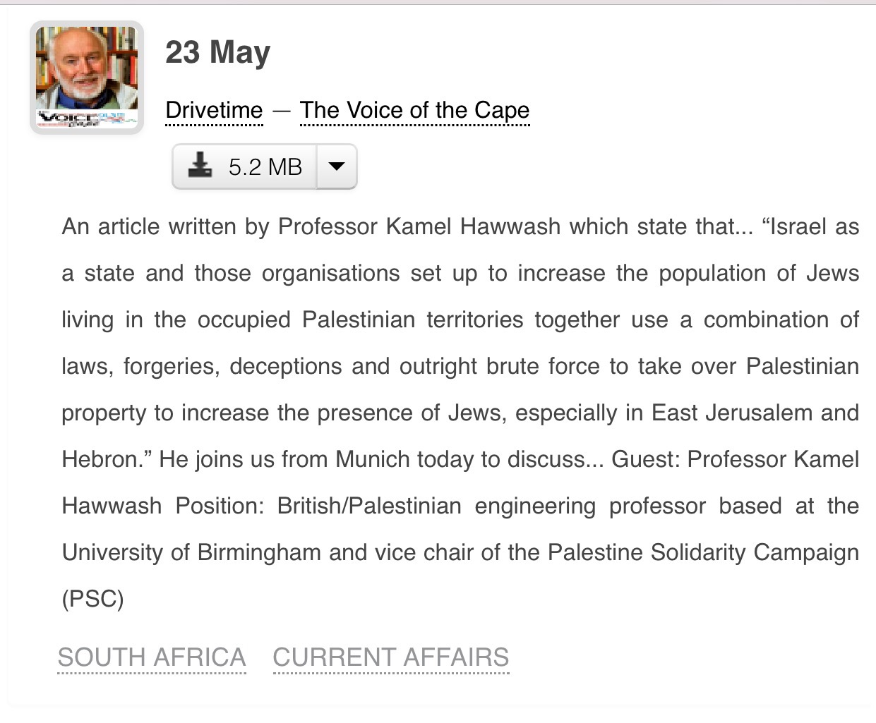 I was interviewed by Voice of the Cape radio about my my article in the Middle East Eye ‘It just ain’t cricket: how Israel transfers Palestinian land to settlers