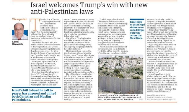 Soon after Trump’s win, the Israeli cabinet approved two sets of draft legislation. One would retroactively grant legal status to illegal outposts across the West Bank in defiance of international law. The other would ban the use of loudspeakers to carry the adhan — Muslim call for prayer. The outpost legalisation bill is likely to pass in the Knesset, despite initial hesitation by Finance Minister Moshe Kahlon, who is now supportive.