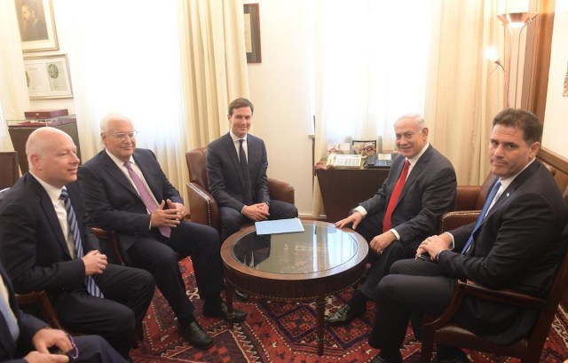 Israel’s Prime Minister Benjamin Netanyahu (R) meets with Jared Kushner (3rd L) in Jerusalem on 21 June 2017 [Handout / Amos Ben Gershom / GPO]