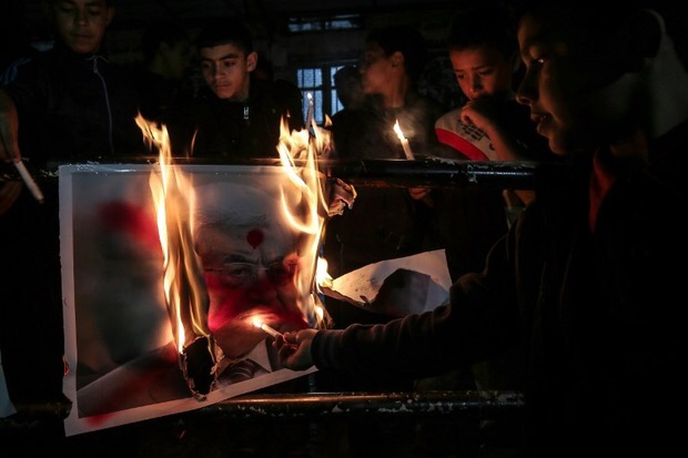Young Palestinians in Rafah burn Abbas’ portrait during a protest against the Israeli blockade of of Gaza in April 2017 (AFP)