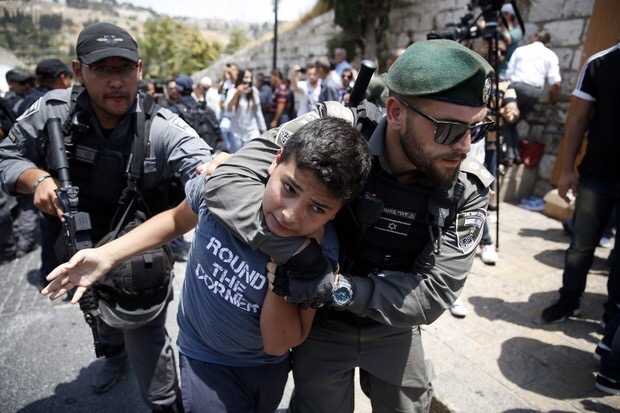 Photo: Israeli border guards detain a Palestinian youth during a demonstration outside the Lions Gate, a main entrance to Al-Aqsa mosque compound, due to newly-implemented security measures by Israeli authorities which include metal detectors and cameras, in Jerusalem’s Old City on 17 July 2017 (AFP)