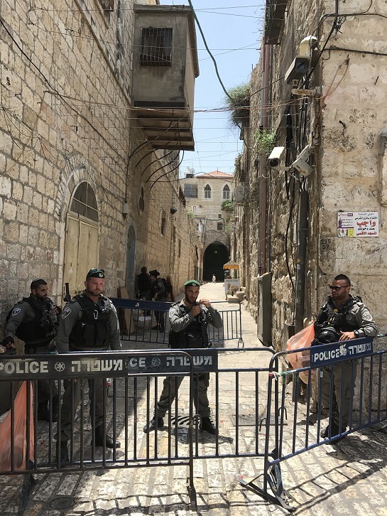 Israeli forces guard a road leading to the main entrance of Al-Aqsa on Monday. Streets and shops were empty as Palestinians protested the new security measures (MEE)