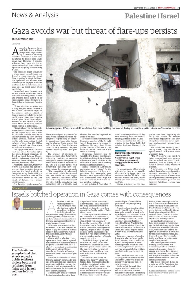 A botched Israeli operation 3km inside Gaza resulted in both physical and political casualties, the latter including Israeli Defence Minister Avigdor Lieberman, who resigned to protest what he said was a lack of determination in the Israeli government to inflict a major blow on Hamas