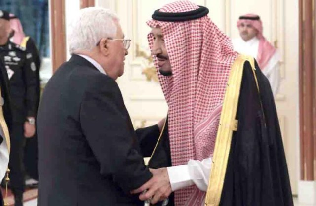 Consensus issue. Saudi King Salman bin Abdulaziz Al Saud (R) greets Palestinian President Mahmoud Abbas during the Arab League Summit in Mecca, May 30. (AFP)