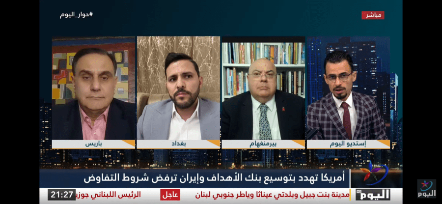 أمريكا تهدد بتوسيع بنك الأهداف وإيران ترفض شروط التفاوض On April 1, 2026 By kamelhawwashIn فلسطين, قناة اليوم, إيران, إسرائيل, بنيامين نتنياهو, بريطانيا, دونالد ترامب, غزةLeave a comment حوار اليوم على قناة اليوم بتاريخ ٣١/٣/٢٠٢٦ https://www.youtube.com/live/P6_7iKK4edI?si=kzlD0TELYAMayArWShare this: Share on X (Opens in new window) X Share on Facebook (Opens in new window) Facebook Share on Pinterest (Opens in new window) Pinterest Share on WhatsApp (Opens in new window) WhatsApp Email a link to a friend (Opens in new window) Email Like Loading...