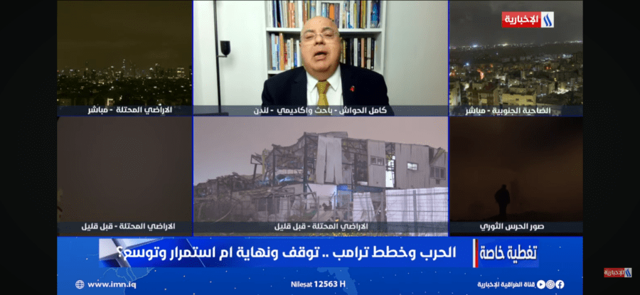 تداعيات الحرب والتصعيد ومسار المفاوضات الإقليمية On April 2, 2026 By kamelhawwashIn فلسطين, إيران, إسرائيل, بنيامين نتنياهو, بريطانيا, تلفزيون, دونالد ترامب, روسيا تغطية خاصة على قناة العراق الإخبارية بتاريخ ٣/٤/٢.٢٦ Share this: Share on X (Opens in new window) X Share on Facebook (Opens in new window) Facebook Share on Pinterest (Opens in new window) Pinterest Share on WhatsApp (Opens in new window) WhatsApp Email a link to a friend (Opens in new window) Email Like Loading...